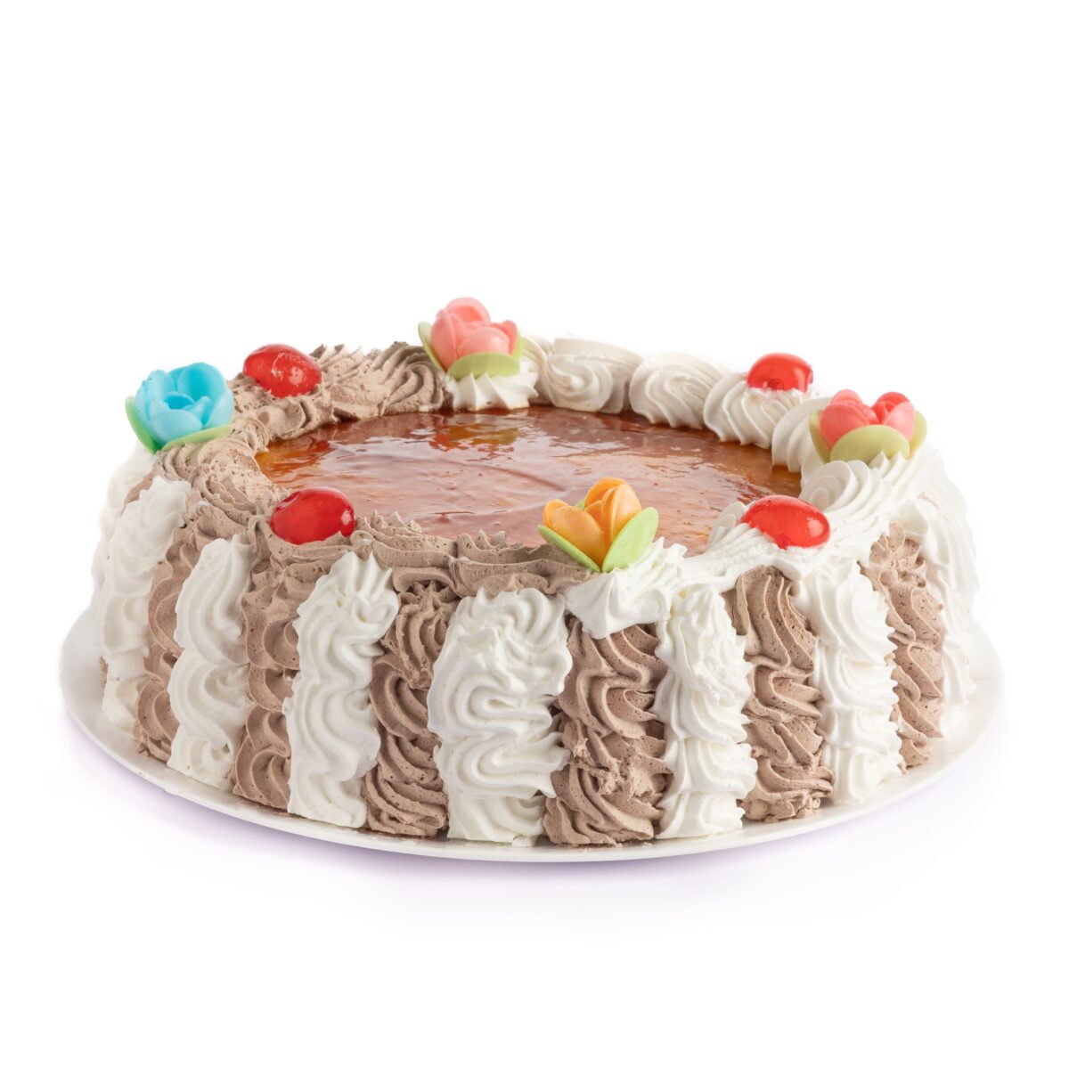 Elaborada con bizcocho esponjoso bañado en almíbar, finas capas de trufa y una elegante cobertura de nata y yema tostada, decorada con guindas y flores de oblea. Un equilibrio perfecto entre dulzura y cremosidad.
